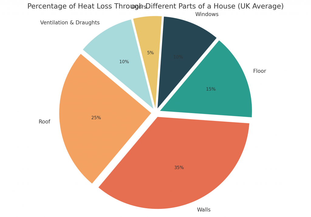 According to the Building Research Establishment (BRE) and Energy Saving Trust, the average uninsulated UK home loses heat through: